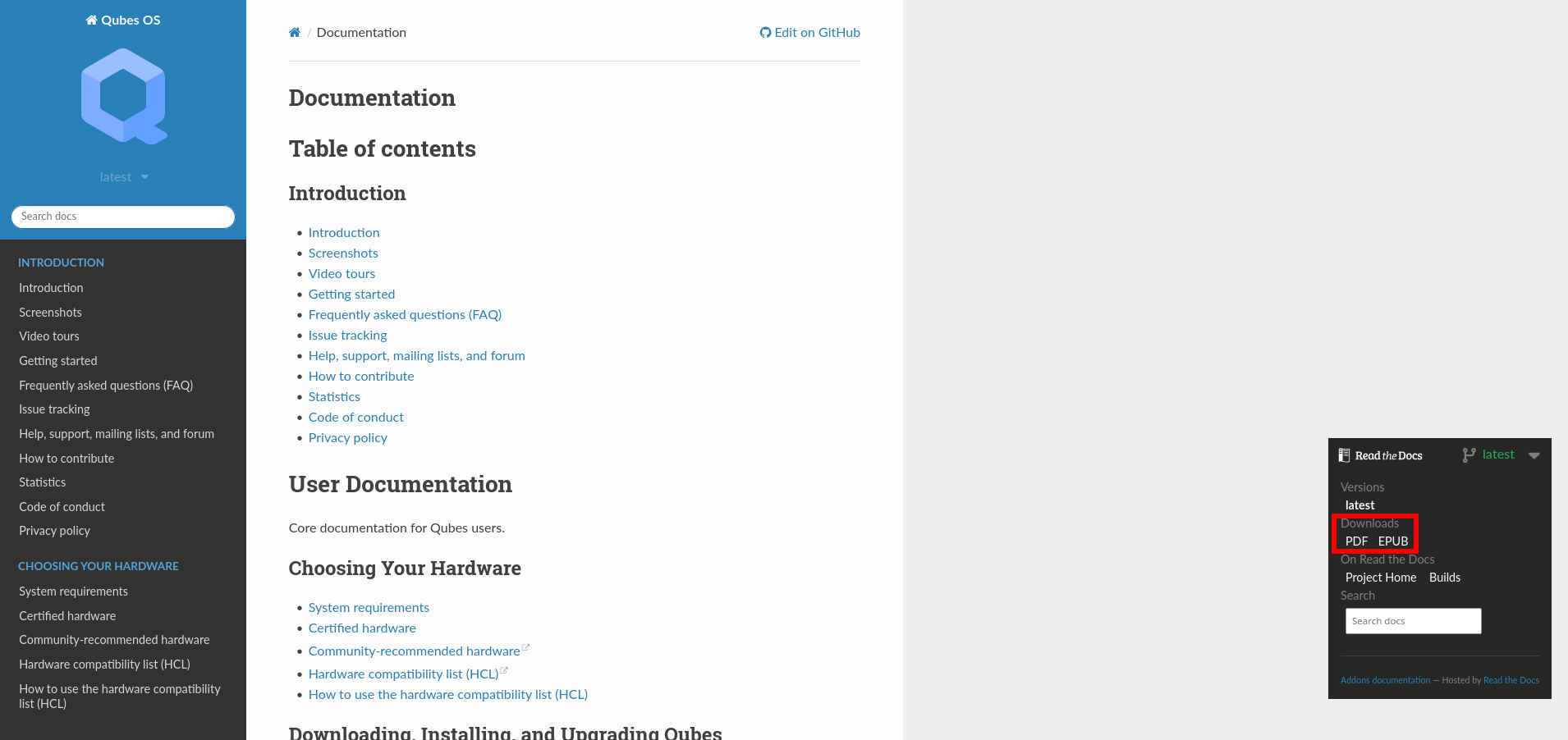 By cloning and regularly pulling from qubes-doc repository, users can maintain their own up-to-date offline copy of the Qubes documentation rather than relying solely on the web and either serve it locally or read the rST files directly. EPUB or PDF versions of Qubes OS documentation can also be downloaded from doc.qubes-os.org: