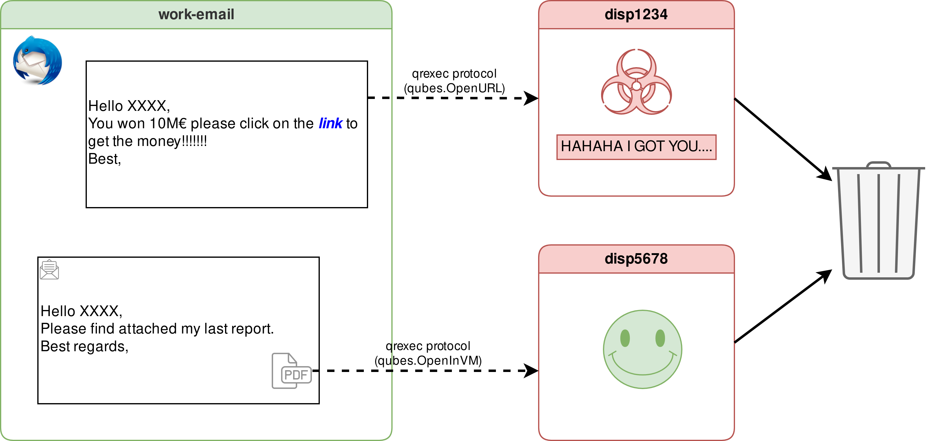 In the work-email qube, the user clicks on a link. This link is opened in a new disposable through the qrexec protocol (qubes.OpenURL). The link contains some kind of malware that infects the disposable qube, but it is harmless for the work-email qube, as the links was opened in a separate environment from the mail client, the mail box is safe. The disposable is later destroyed.